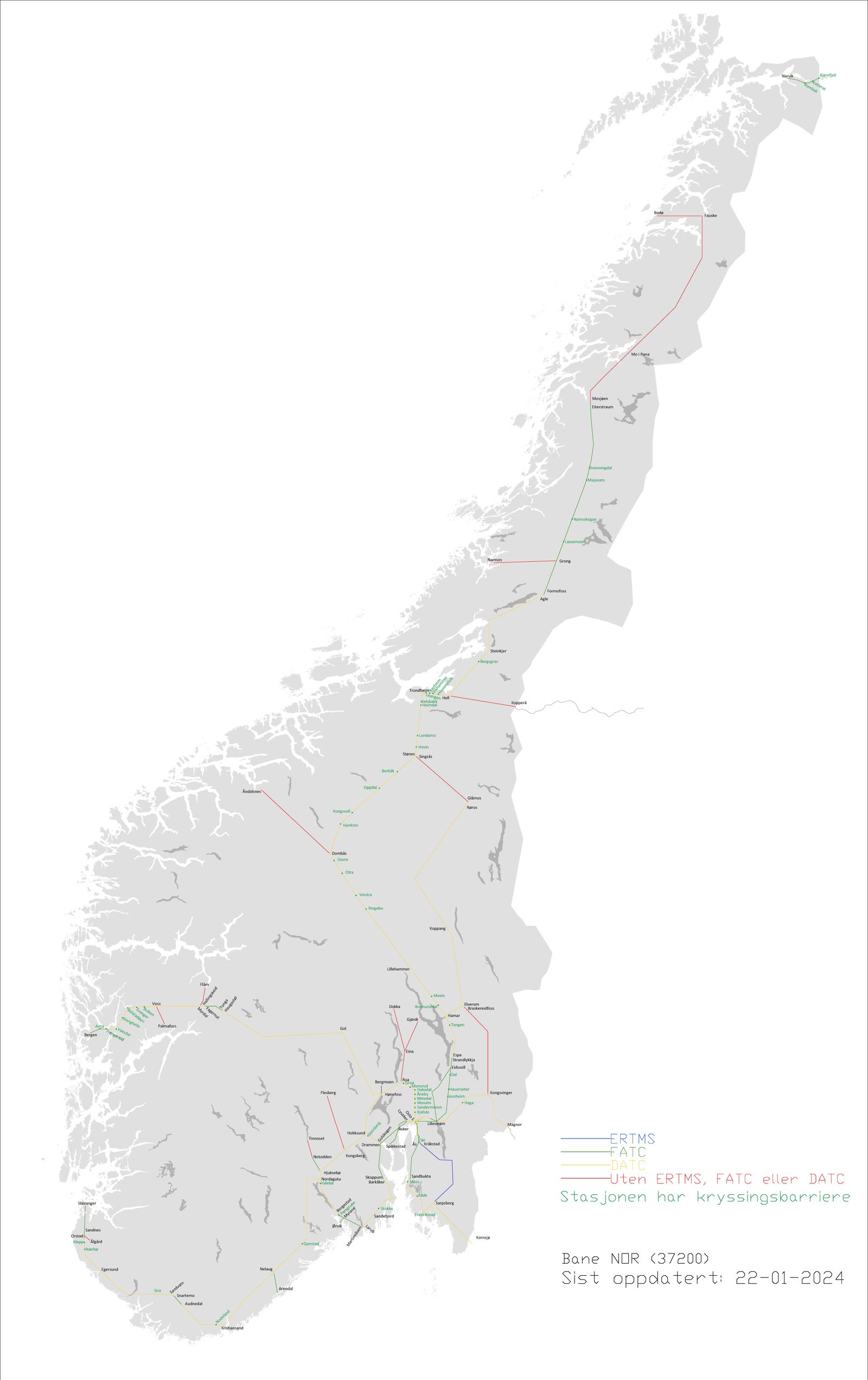 Vedlegg til Network Statement 2024 Strekningskart Tilknyttet nett Internasjonal profil JBV NO1 – prEN 15273 Dynamisk profil Multipurpose profil Aksellast Metervekt Linjestigninger Linjehastighet Elektrifiserte linjer Toglederområder og Trafikkstyringssentraler Kommunikasjonssystemer System for automatisk hastighetsovervåking Kommunikasjon for ERTMS Rasutsatte strekninger Dyrepåkjørsel Tunneler Avtale om sportilgang og bruk av tjenester (AST) Søknadsskjema om infrastrukturkapasitet Metode for samfunnsøkonomisk verdsetting av ruteleietildeling Tilgang til godsterminal Oslo Economics (2022) "Segmenter i persontrafikk og godstrafikk på norsk jernbane" Grunnpris Påslag Stasjoner Ekstern lenke Godsterminaler Ekstern lenke Tømmerterminaler Ekstern lenke Sidespor Driftsbanegårder og hensetting Ekstern lenke Verksteder Ekstern lenke Serviceanlegg Havneterminaler Ekstern lenke Avlastningsanlegg Påfyllingsanlegg for drivstoff System for automatisk hastighetsovervåking Forstørr bildet Oversiktskart hastighetsovervåkning. Illustrasjon: Bane NOR